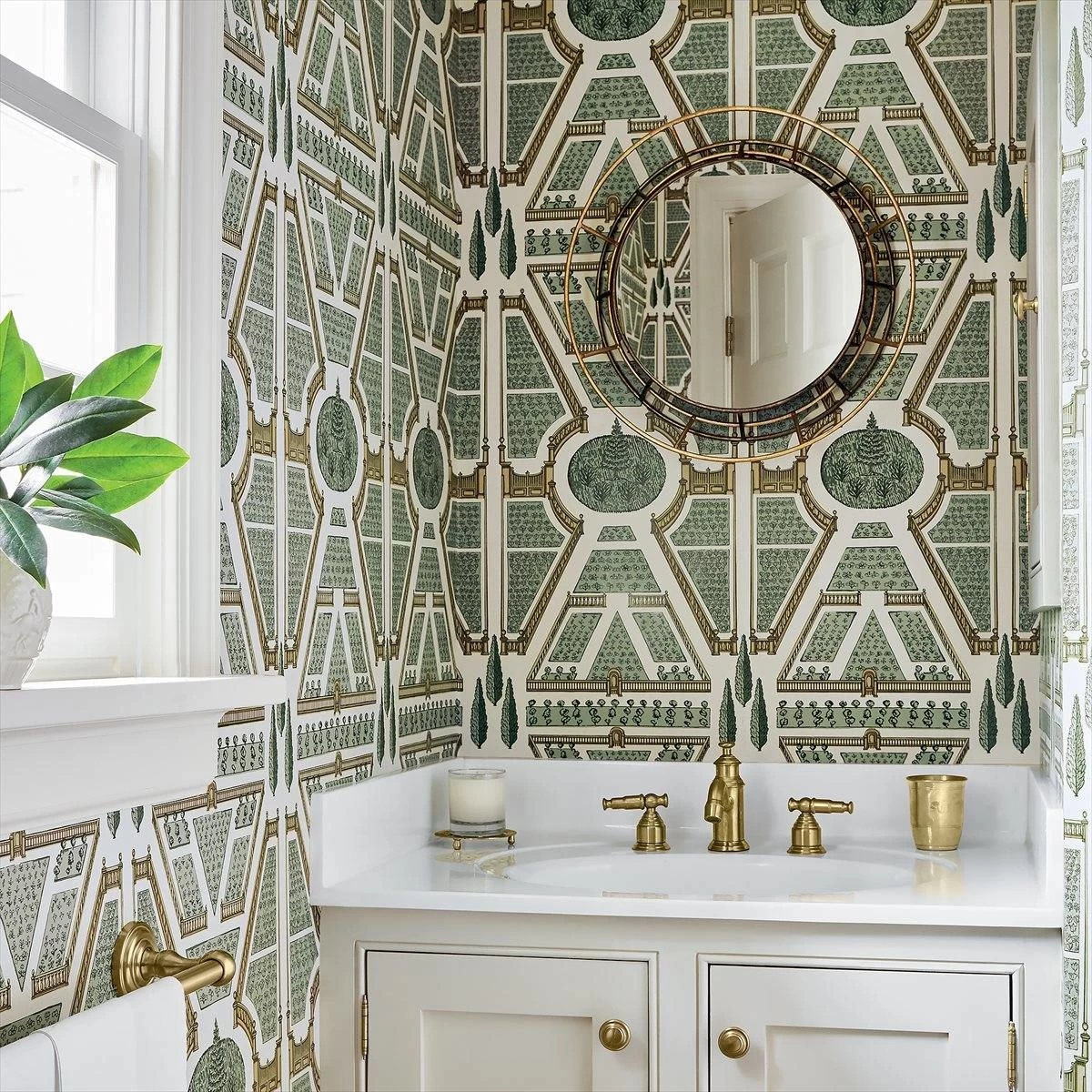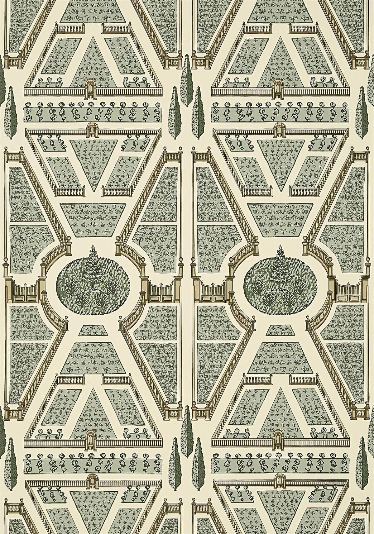 Aerial Garden behang uit de Anna French Savoy Collection wordt beïnvloed door de baanbrekende smaak van de jaren 1920, waardoor Gaya backdrop een extravagant assortiment is van geconsolideerde strategieën van printen, weven en wandbekleding die de realistische wiskunde van Art Deco behendig combineren met intrigerende botanische elementen.