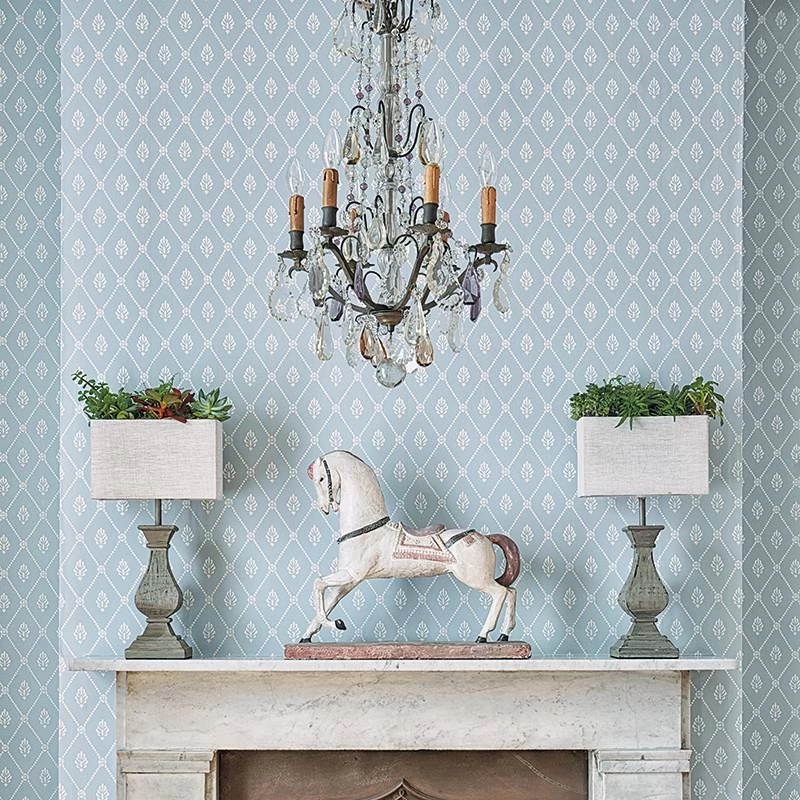 Taking its title from the popular Victorian girls’ name, the Alma wallpaper features a small-scale diamond trellis enclosing a simple sprig leaf motif. Set on grounds of powder blue, grey, sand and ecru, this smart little print bestows a modern feel on a traditional motif.