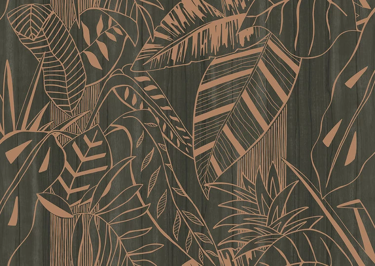ARTE Eden behang toont een paradijselijk junglemotief tegen een achtergrond van houtnerven. Op het highgloss behang zijn gestileerde planten en boomstammen te zien. De hoogglansfolie weerkaatst het licht, waardoor het bijna lijkt alsof er wat zonnestralen door de jungle schemeren.