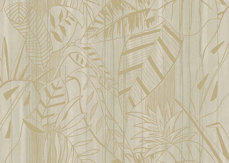 ARTE Eden behang toont een paradijselijk junglemotief tegen een achtergrond van houtnerven. Op het highgloss behang zijn gestileerde planten en boomstammen te zien. De hoogglansfolie weerkaatst het licht, waardoor het bijna lijkt alsof er wat zonnestralen door de jungle schemeren.Â