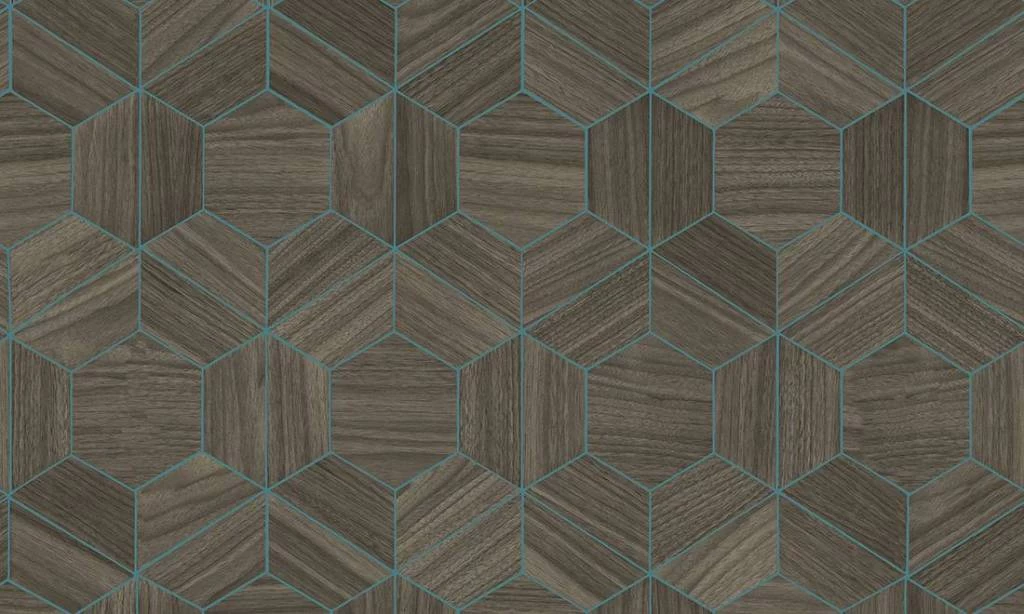 Het behang ARTE Hive heeft een geometrisch patroon van vijfhoeken met de natuurlijke uitstraling van hout fineer.Â