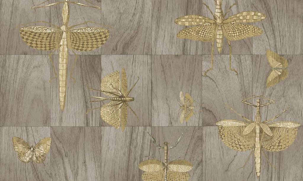 Het behang ARTE Wings heeft een geometrisch blokpatroon, ‘ingelegd’ met grote en kleine insecten, sprinkhanen om precies te zijn.