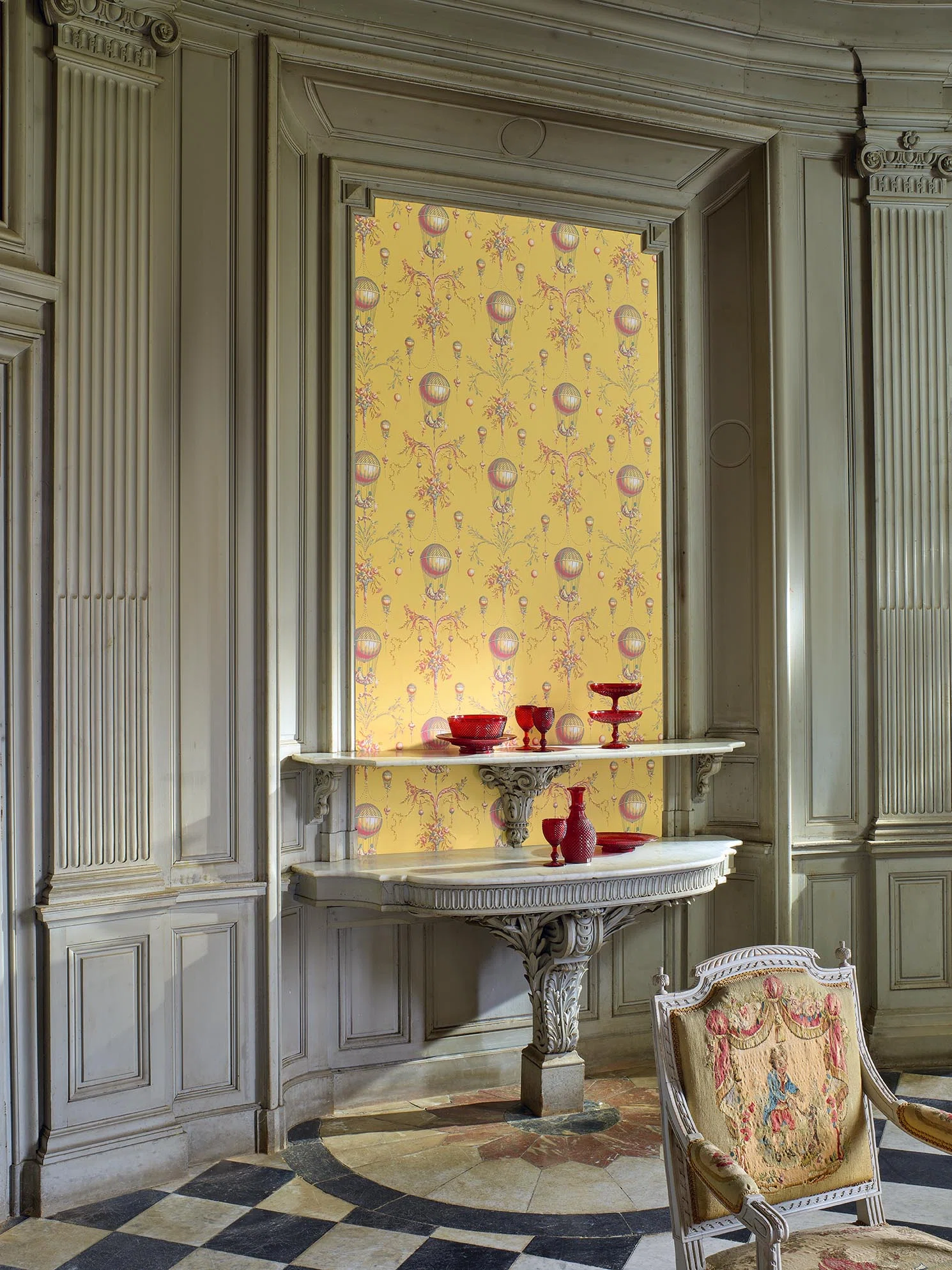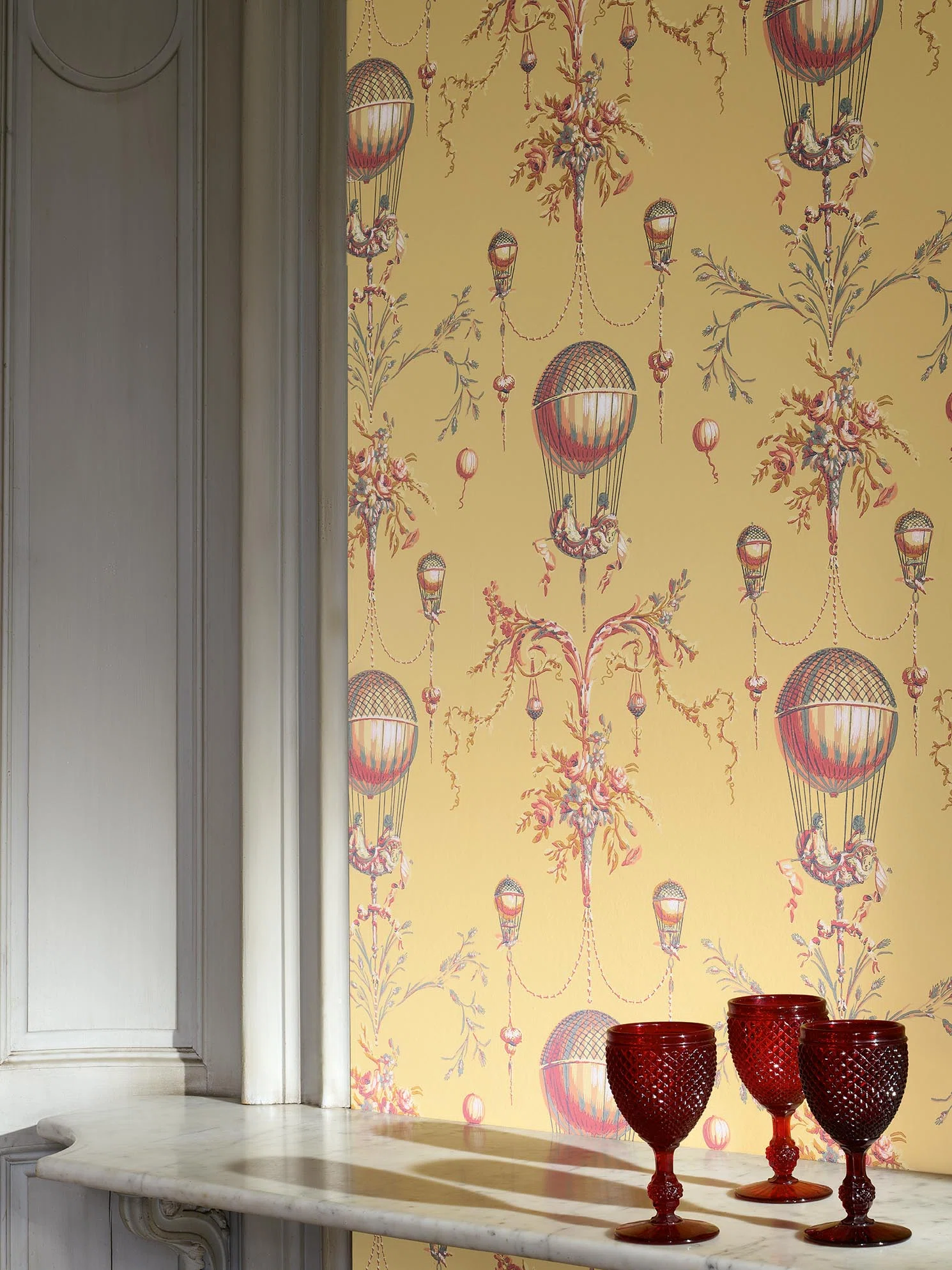 La Roziere Fond Uni is geïnspireerd op de eerste luchtballonnen, die werden ontworpen door de gebroeders Montgolfier in 1783. Deze muurbekleding van Braquenié, uit de Pierre Frey Braquenié Collection Anniversaire 1823, toont de grote sierlijke ballonnen, die zweven door een kleurrijke lucht gevuld met boeketten bloemen, sierlijke guirlandes en kronkelende takken. Een tijdloos paneelbehang dat perfect is voor een luxe, chic en exclusief interieur.