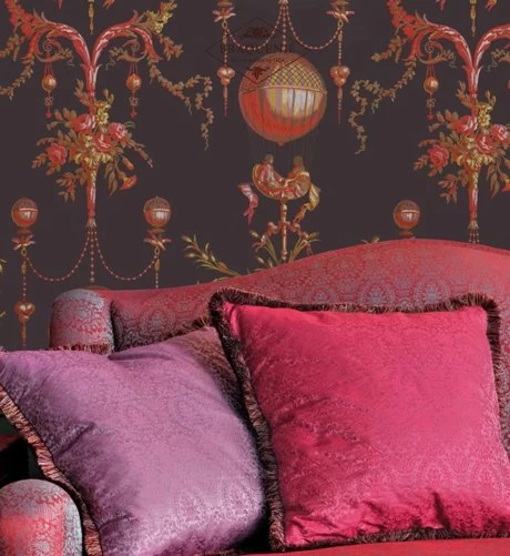 Dit heteluchtballonmotief is kenmerkend voor de ‘ballonmanie’ die na de eerste vluchten van de Montgolfier-broers in 1783 door de decoratieve kunsten vloog. Het arabesk-paneel is een reproductie van de ballon die vanuit de Jardin des Tuileries in Parijs werd gevlogen op de eerste van December van dat jaar, met twee figuren die spandoeken zwaaien. Het origineel was met houtblok gedrukt op samengevoegd papier, waarschijnlijk door de fabriek in Reveillon, waarvan de tuinen werden gebruikt als opstijgplaats op testvluchten door Etienne Montgolfier en Pilatre de Rozier. Het is gedrukt op een effen achtergrond of op Gisors-strepen.