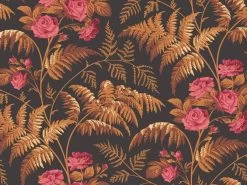 Een hoofdbestanddeel van de Engelse landtuin, de blousy Rose is evenzeer geliefd vanwege zijn ruikende geur als zijn stralende blad. Dit charmante ogee-padontwerp met weelderige, ontluikende boeketten is omgeven door varenbladeren, waardoor een rijk organisch, subtiel gedetailleerd motief ontstaat. Deze typisch Engelse combinatie is opnieuw uitgevonden in onverwachte, eigentijdse paletten van levendig Cerise & Burnt Orange en diep zwart, en koel wit en ijsblauw op denim, evenals een klassiek getinte rood en bladgroen op rokerige houtskool.