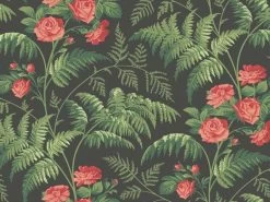 Een hoofdbestanddeel van de Engelse landtuin, de blousy Rose is evenzeer geliefd vanwege zijn ruikende geur als zijn stralende blad. Dit charmante ogee-padontwerp met weelderige, ontluikende boeketten is omgeven door varenbladeren, waardoor een rijk organisch, subtiel gedetailleerd motief ontstaat. Deze typisch Engelse combinatie is opnieuw uitgevonden in onverwachte, eigentijdse paletten van levendig Cerise & Burnt Orange en diep zwart, en koel wit en ijsblauw op denim, evenals een klassiek getinte rood en bladgroen op rokerige houtskool.
