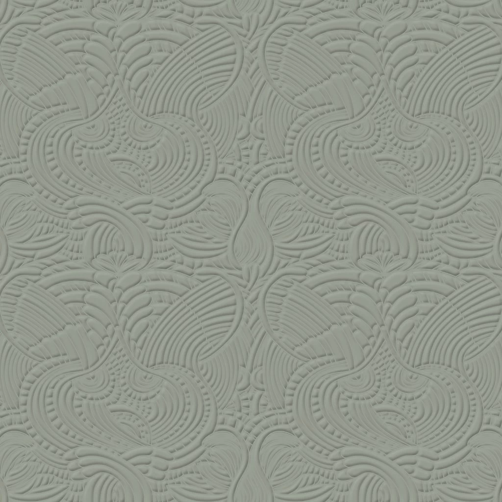 3D muurbekleding met de look van zacht suède, geïnspireerd door de natuurlijke outfit van de Dodo Pavone – een zachte pluimage van zilverkleurige veren met verschillende tinten van grijs, blauw, beige en wit.