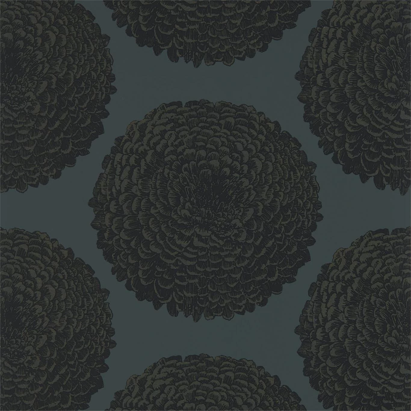 Fantastische Pompom-dahlia’s bloeien zelfverzekerd op dit Harlequin-behang terwijl prachtige, ingewikkelde accenten de zachtste metallic glinsters vertonen.