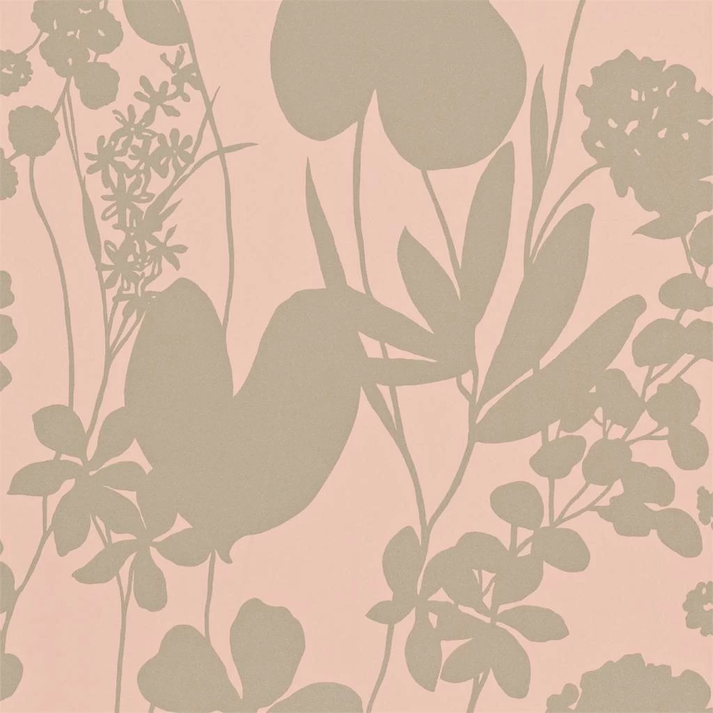 Amazilia-achtergronden – Nalina. Een tweekleurig grafisch behangontwerp met bloemensilhouetten op een effen achtergrond, geaccentueerd met glitterinkt. Ideaal voor slaapkamers.