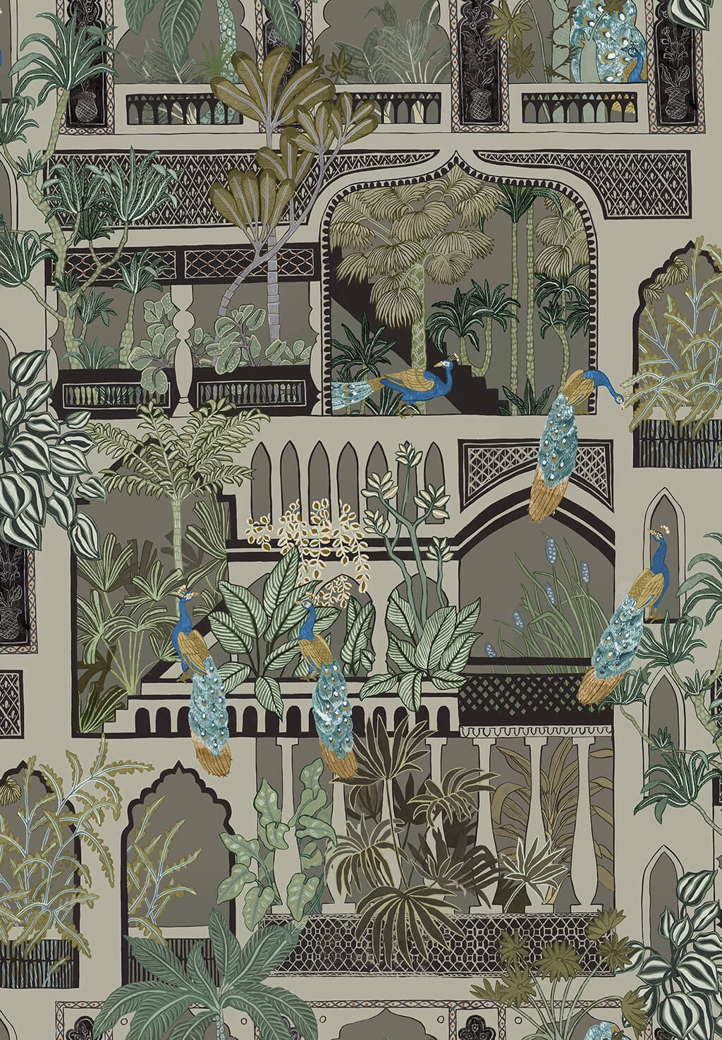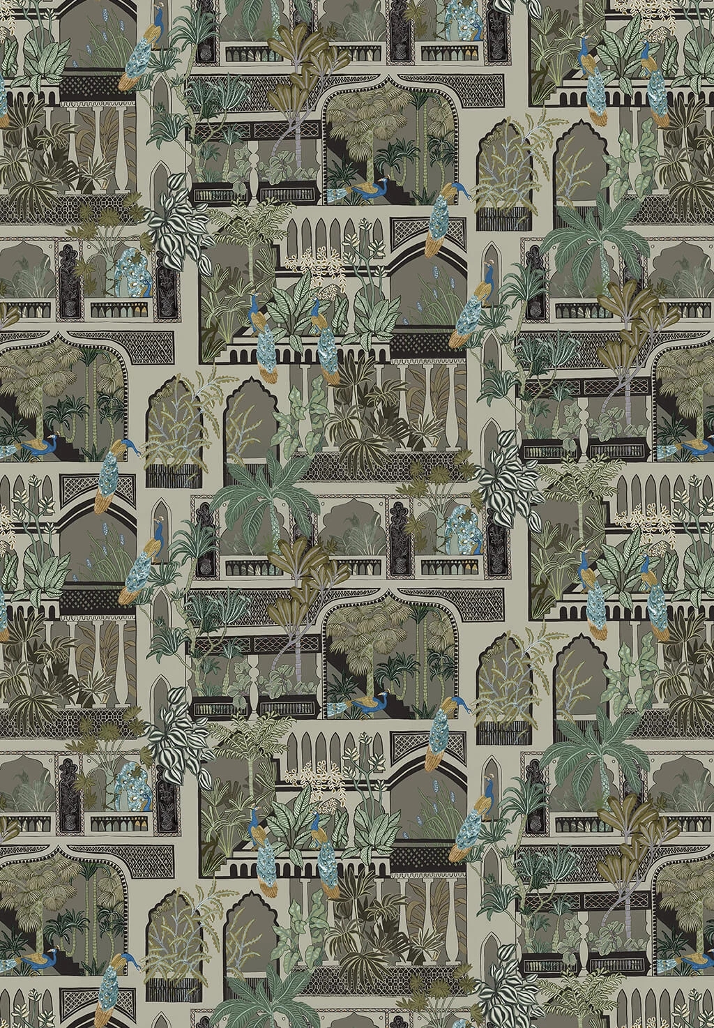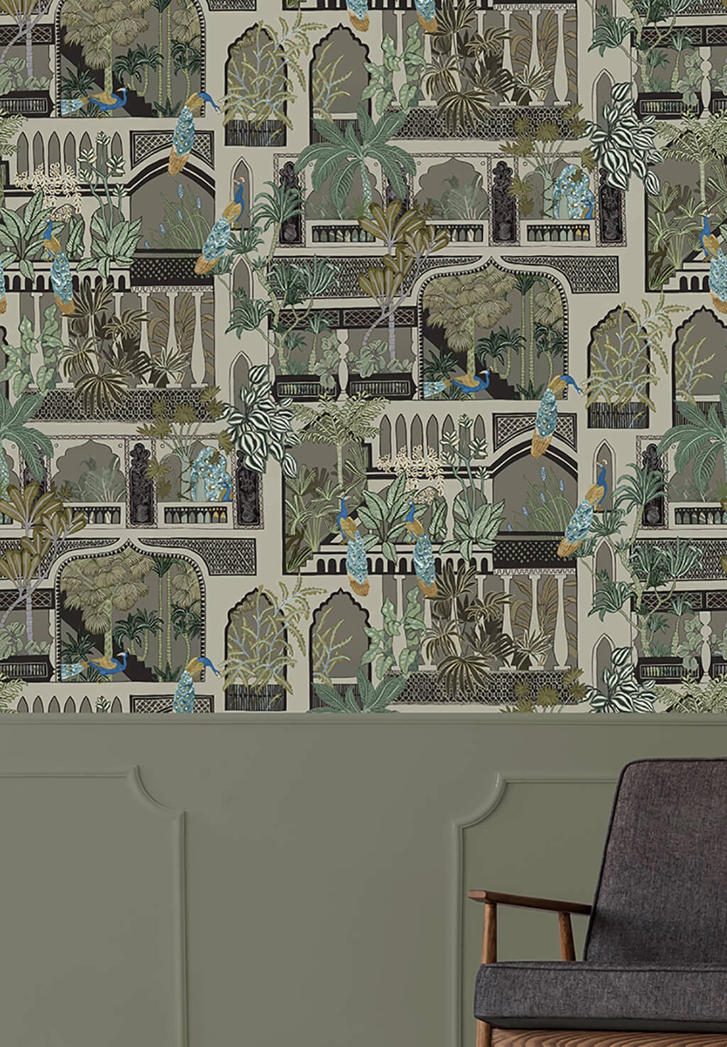Peacock Arches is een behang dat is geïnspireerd op de Indiase architectuur. Deze muurbekleding van Josephine Munsey, uit de collectie Portfolio 1, toont architecturale deuropeningen en ramen met weelderige bladeren en prachtige pauwen. Een kleurrijk behang dat perfect is voor een poëtisch, bijzonder en uniek interieur.