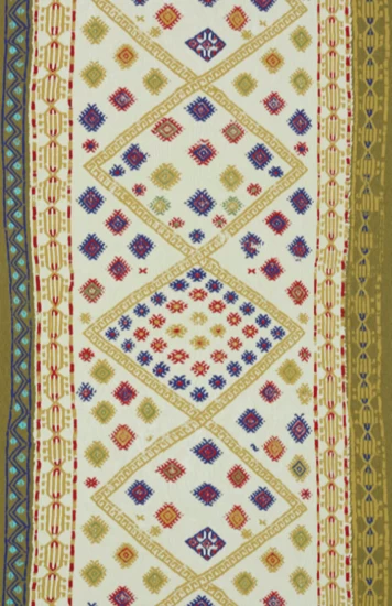 Het Pierre Frey La Yourte du Nomade behang is een interpretatie van een zadelhoes zoals die in de traditionele Perzische beschaving ontworpen werden. Dat zadelhoesen tot een waar kunstwerk gemaakt werden getuigt van de bevoorrechte positie van paarden in de oude Perzische tijden. Bedoeld voor verticaal gebruik, als verticale strepen op de muur. Ook mogelijk voor horizontaal gebruik, als rand.