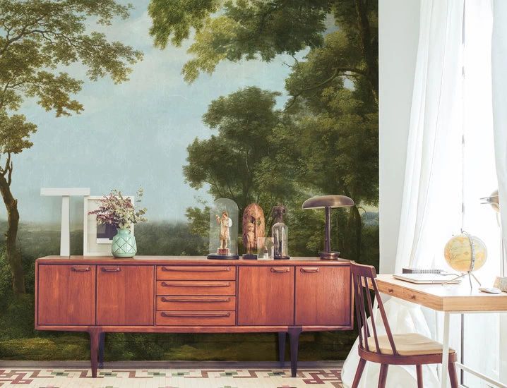 Het klassieke landschap behang is door illustrator en art director Carlos Buendia ontworpen. En hij heeft een hele eigen grafische stijl.