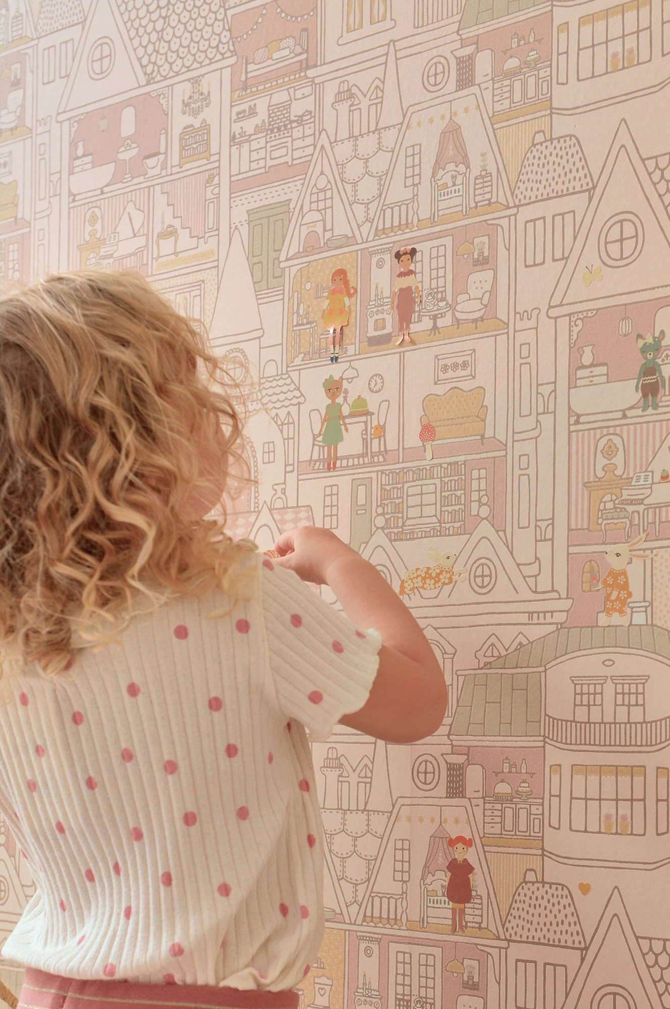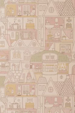 NB. Bij dit bijzondere behang is het mogelijk om stickervellen (2 x A4) te bestellen om het poppenhuis tot leven te brengen. De stickers zijn PCV vrij en eenvoudig meerdere keren te gebruiken zonder het behang te beschadigen. De stickervellen kosten € 22,50 bij 2 vellen.