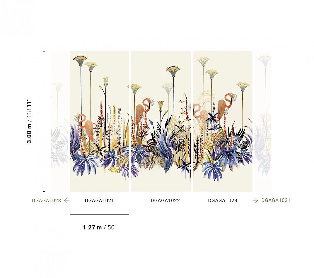 Let op: Dit paneel bestaat uit 3 banen. Deze banen zijn ieder 3 meter hoog en 127 centimeter breed. Samengevoegd is het paneel dus 3 meter hoog en 3,81 meter breed. Je maakt deze mural compleet door de 3 panelen met artikelcodes DGAGA1021, DGAGA1022 en DGAGA1023 te bestellen (zie afbeelding).