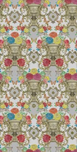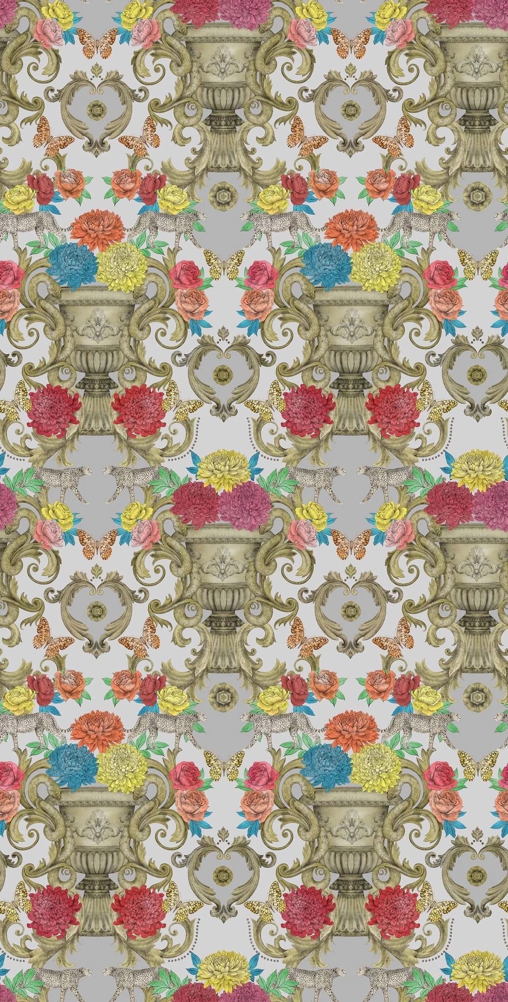 Matthew Williamson Chateau behang: handgetekende krullen, pleisterwerk en oud metselwerk vormden het uitgangspunt voor dit decadente ontwerp, geïnspireerd op de vervaagde grootsheid van statige huizen en tuinen. De stenen urnen zitten vol met zomerbloemen. En is perfect voor wie jong van geest is, of wie zijn zoon of dochter wil verrassen, met dit prachtige droomachtige kinderkamer behang.