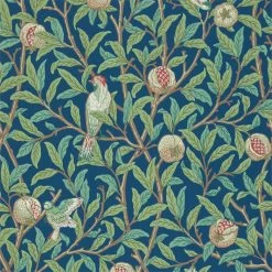 Dit prachtige behangontwerp toont vogels die neerstrijken, neerstrijken en pikken tussen takken van gebladerte en granaatappelfruit. Het dateert uit 1926 en was een van de laatste blokbedrukte behangpapieren ontworpen door Morris en Co. en geïnspireerd op het veel eerdere Fruit-behang. Verkrijgbaar in onweerstaanbare kleuren, waaronder een op een prachtige metallic achtergrond.