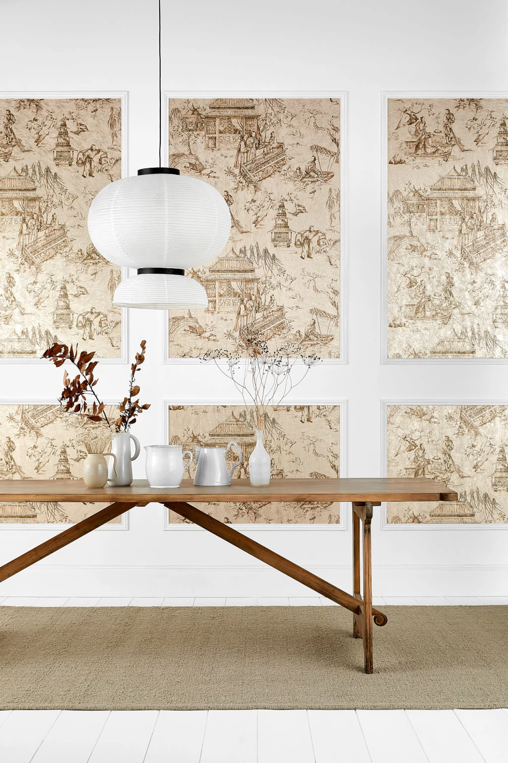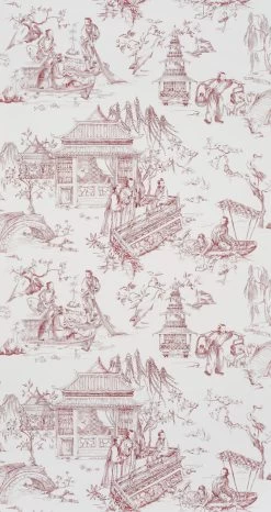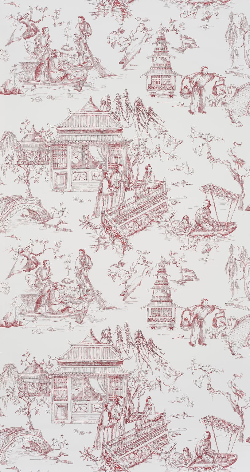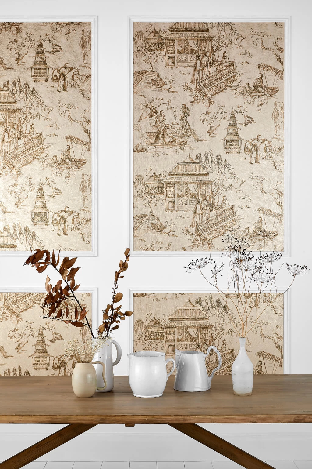 Pierre Frey Le printemps du mekong metalen ontwerp is gebaseerd op een Toile de Jouy, toont chinoiserieën of vignetten uit het dagelijks leven langs de rivier.