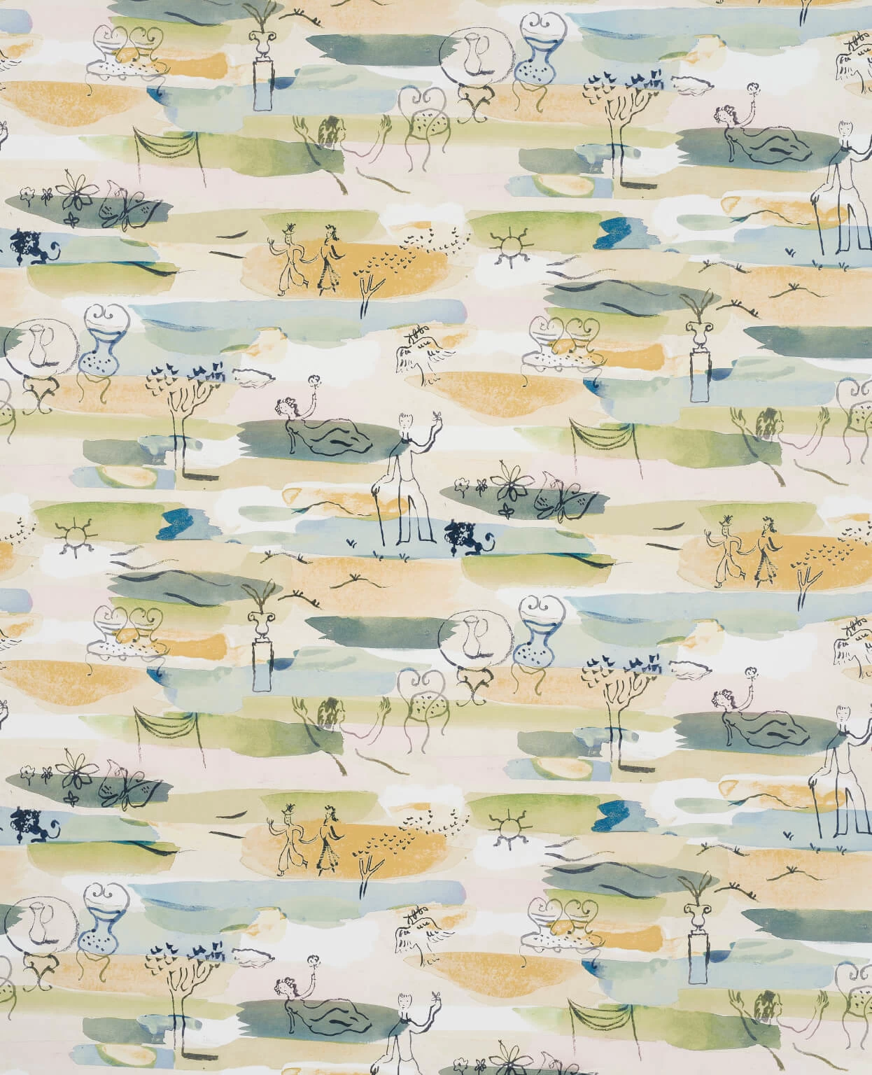 Een wandeling door een Parijse tuin zoals bedacht door Denis Malcles in de jaren 40, waar kleuraccenten en lichte motieven samenkomen. Pierre Frey heeft in de jaren veertig veel ontwerpen van deze kunstenaar bewerkt. Zijn onnavolgbare stijl wordt gekenmerkt door een vleugje surrealisme met poëzie en frisheid. Pierre Frey heeft dit motief, dat tot nu toe in de projectfase was gebleven, nooit bewerkt.