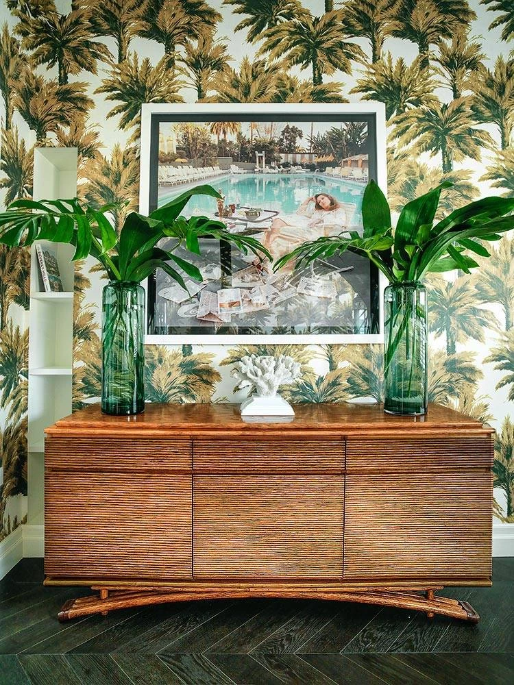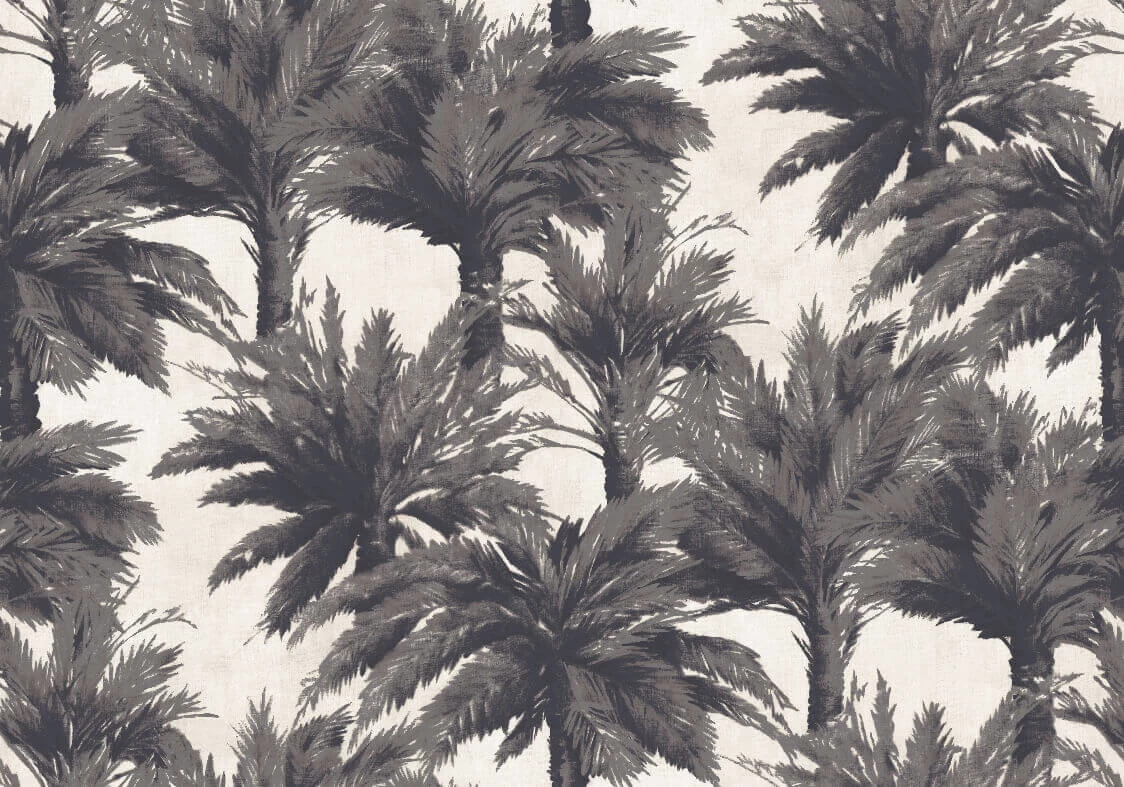 Het behang Mauritius van Pierre Frey heeft prachtige geschilderde palmbomen. Het patroon van het canvas is zelfs zichtbaar.