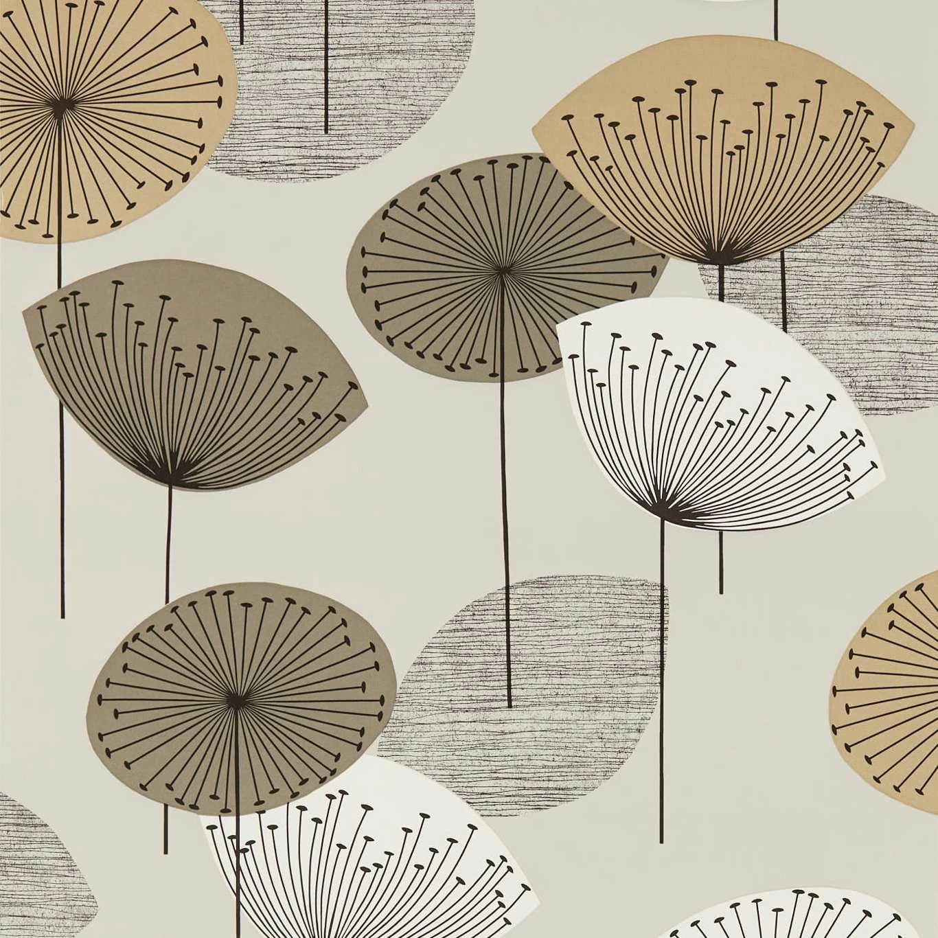 Dandelion Clocks behang. Fiona Howard creëerde dit leuke retro-patroon uit de jaren 50 voor de Sanderson-studio in 2009, met gestileerde paardenbloemkoppen met zaden die vanuit een centraal punt stralen.